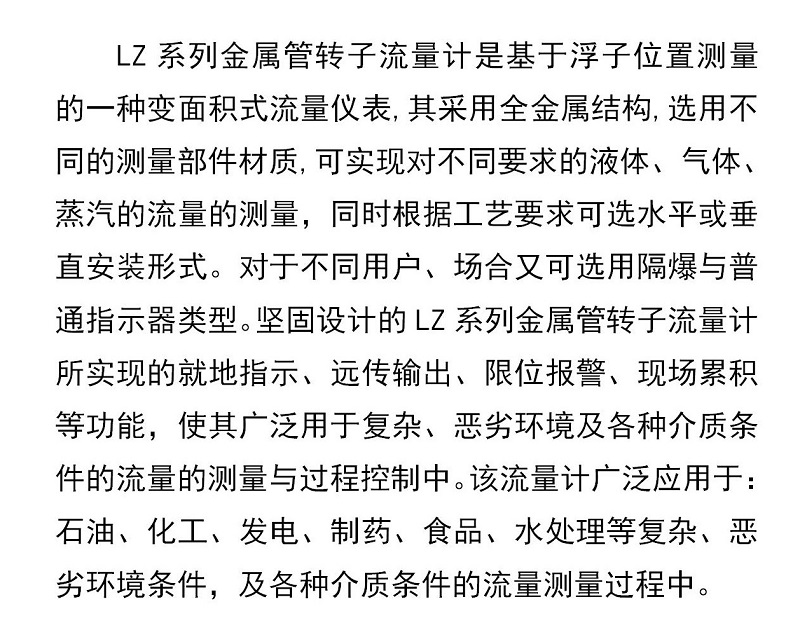 LZ系列金屬管轉子流量計是基于浮子位置測量的一種變面積式流量儀表,其采用全金屬結構,選用不同的測量部件材質,可實現(xiàn)對不同要求的液體、氣體、蒸汽的流量的測量,同時根據工藝要求可選水平或垂直安裝形式。